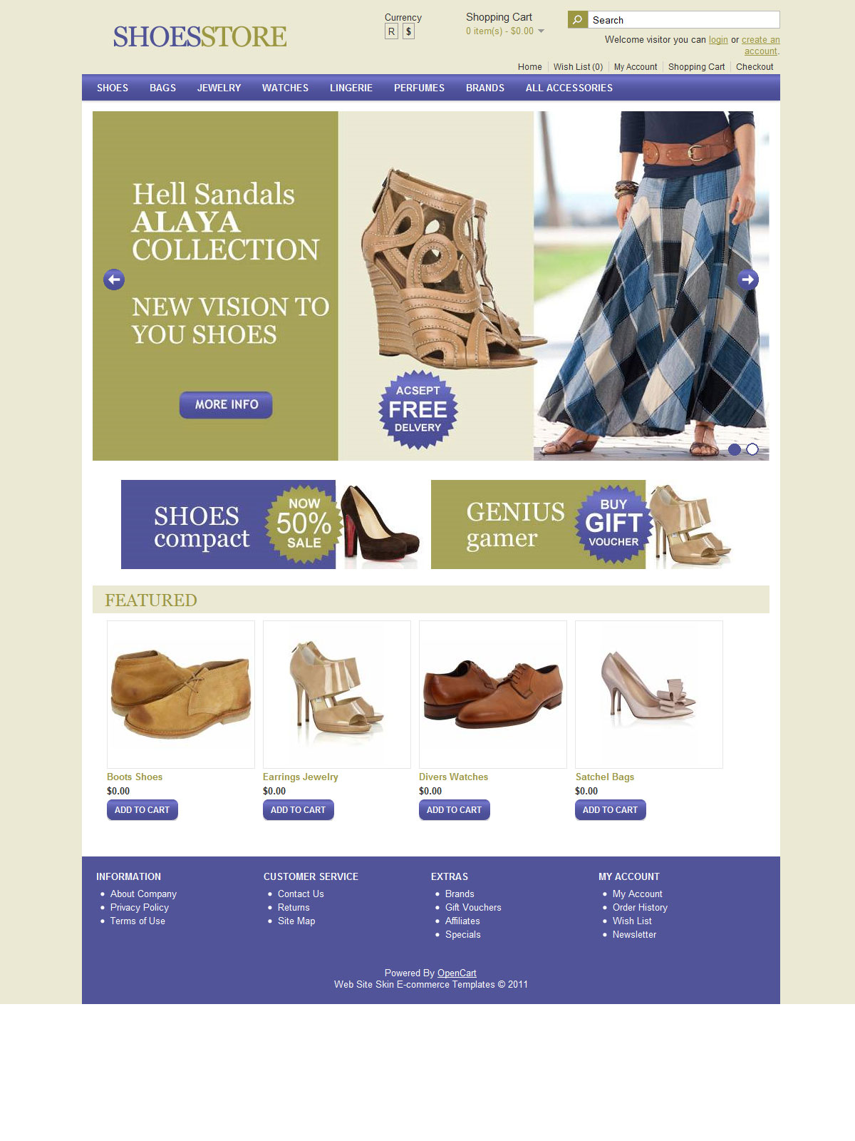Shoes Store OpenCart Template разработана специально для магазинов Женской и Мужской Обуви. Это Туфли, Босоножки, Ботинки, Сандалии, Сапоги, Кроссовки, Уги, Ботфорты и другие товары. Гармоничное сочетание лимонного и фиолтового цвета лучшая декорация для ваших товаров. Очень красивый чистый и профессиональный дизайн.