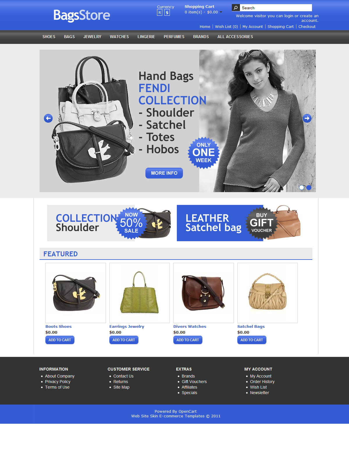 Bags Store OpenCart Template разработана специально для магазинов продающих Женские и Мужские Сумки. Это Cross Body, Shoulder Bags, Totes, Satchel, Clutches, Hobos, Checkbook Wallets. Гармоничное сочетание чёрного и синего цвета. Основной слоган "Лучшее украшение Вашего магазина это Ваши Товары". Очень красивый чистый и профессиональный дизайн.