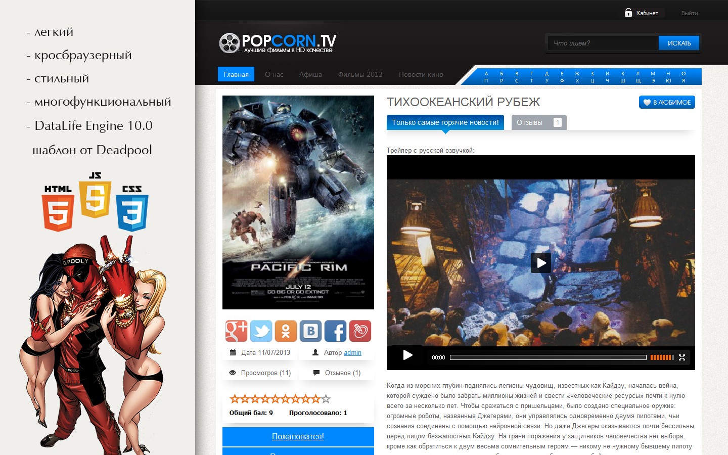 Краткое описание: Всем привет! Недавно мной был разработан совершенно новый кино шаблон, который включает в себя почти все необходимое для создания онлайн кинотеатра или торрент трекера (или одновременно того и другого). Дизайн выдержан в строгих тонах, и смотрится очень стильно. Шаблон заточен под DLE 10.2, которая на данный момент является самой актуально CMS. В общем смотрите видео о шаблоне, сами все увидите.