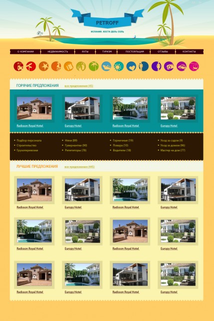 Сайт по аренде покупке недвижимости , и сопутствующих услуг и развлечений на побережье. Сайт в стиле флэт. Плоский дизайн.