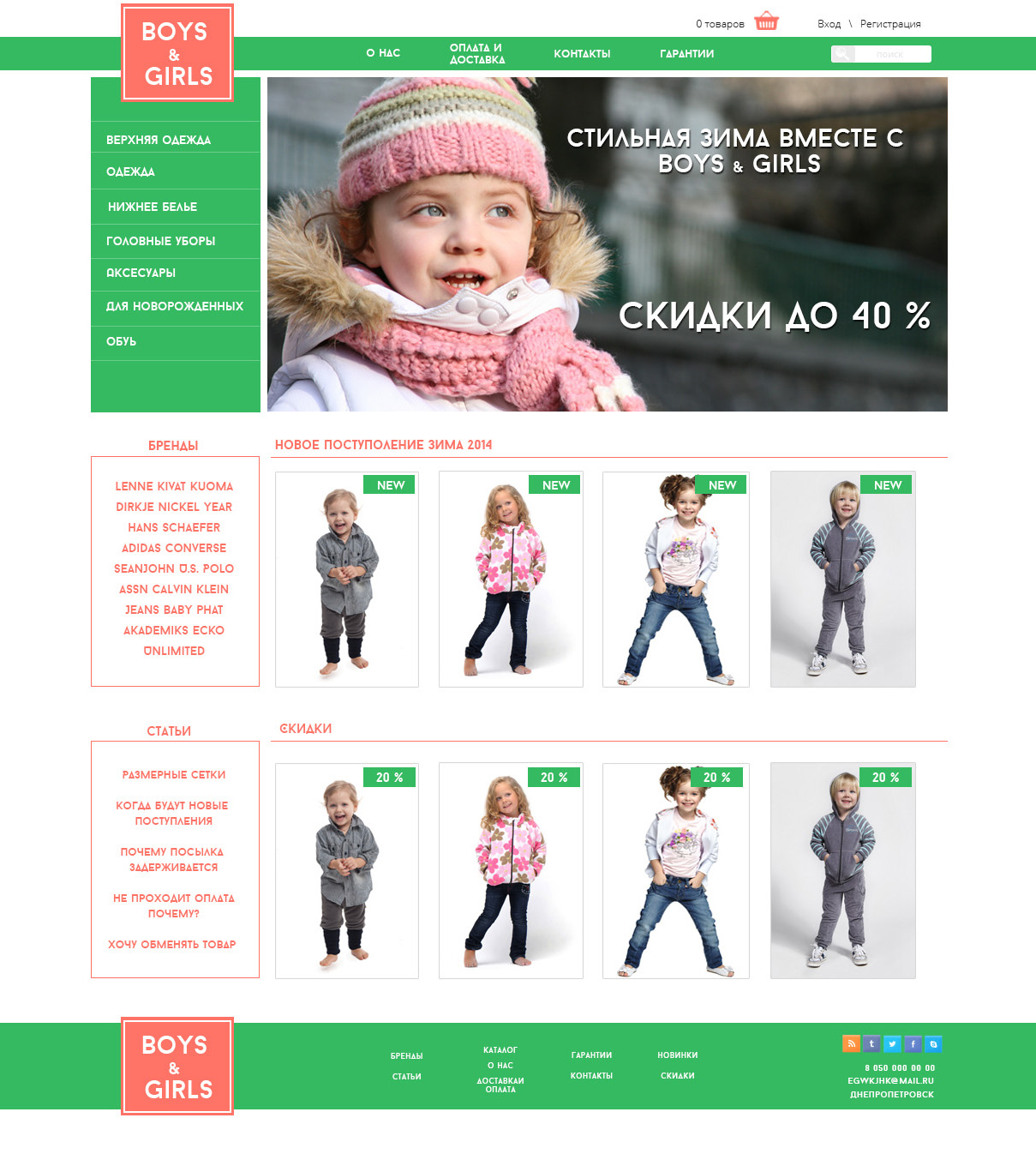 Магазин детской одежды.Есть готовая главная страница и страница кталога на которой позиции товара и фильтр(могу отправить jpg. на почту если заинтересует ) Так же отрисую все необходимые страницы (котакты,карточка товара, корзина и т.д.)Сайт выполнен в ярких цветах ассоциируемых с детством.Простая и удобная навигация пзволит покупателю не потеряться на сайте и выбрать именно то что ему нужно. Есть место для новостей, банер с акциями и другими предложениями завликающими покупателя.