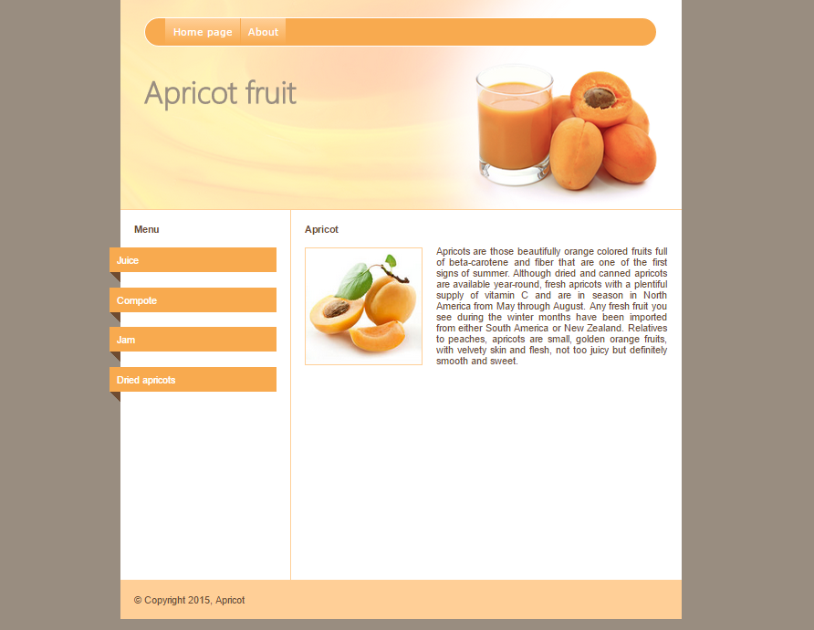 Красивый шаблон для Вашего сайта, выполненный в ярких тонах. Выгодно подчёркивая навигационную панель и меню, они нисколько не отвлекают от основного контента. Кстати, пункты меню декоратированы таким образом, что кажется - они "обхватывают" собою сайдбар. Шапку шаблона украшает изображение абрикосов со стаканом одноимённого сока.