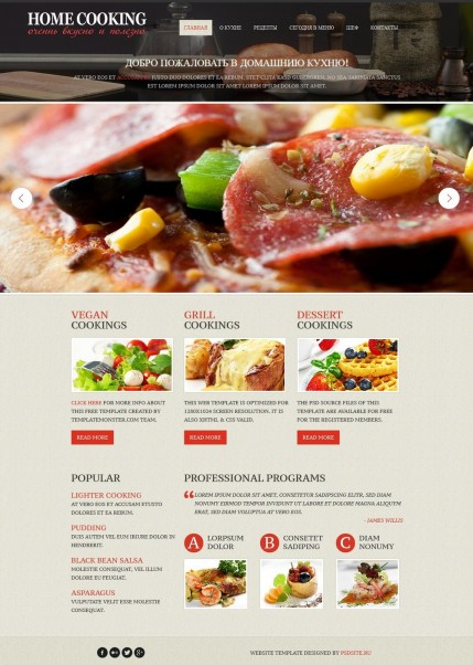 Пяти страничный HTML шаблон для сайта о вкусной еде, ресторанах, кафе.