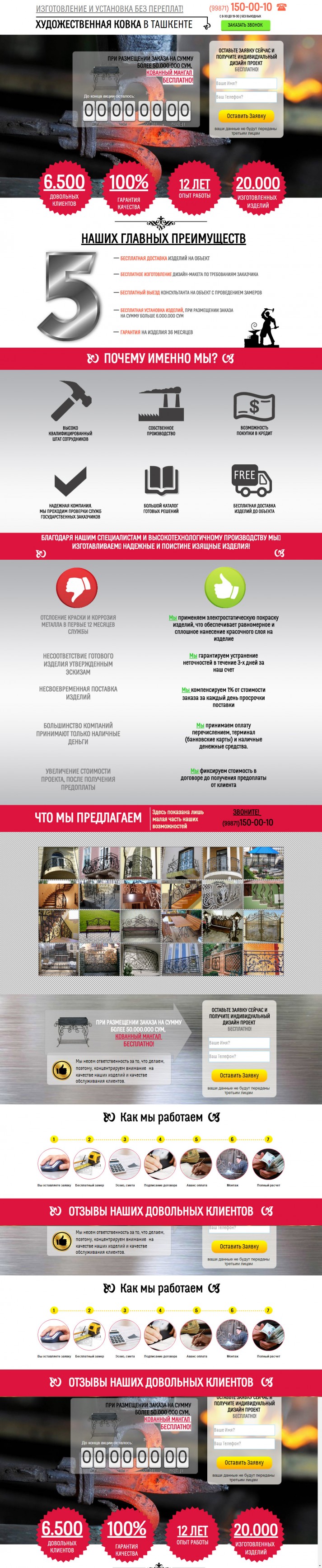 Сайт Landing page полностью готов для работы в сфере художественной ковки. Landing page выпонен в спокойных тонах с ярким акцентом для привлечения внимания в нужных местах.