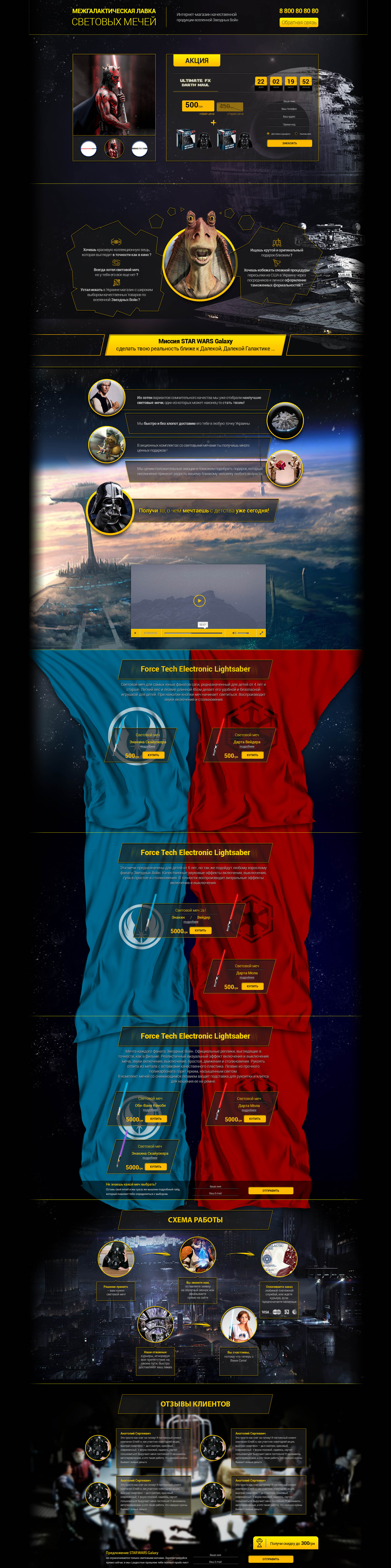 Делал дизайн для страницы продающая предметы на тематику звездных войн, но клиент пропал и как обычно работа валялась на полке пылясь. Сейчас решил продать. PSD все по слоям, все уже разреано. Осталось взять и сверстать (могу сверстать также и я, по цене с установкой). Пишите на почту для деталей.