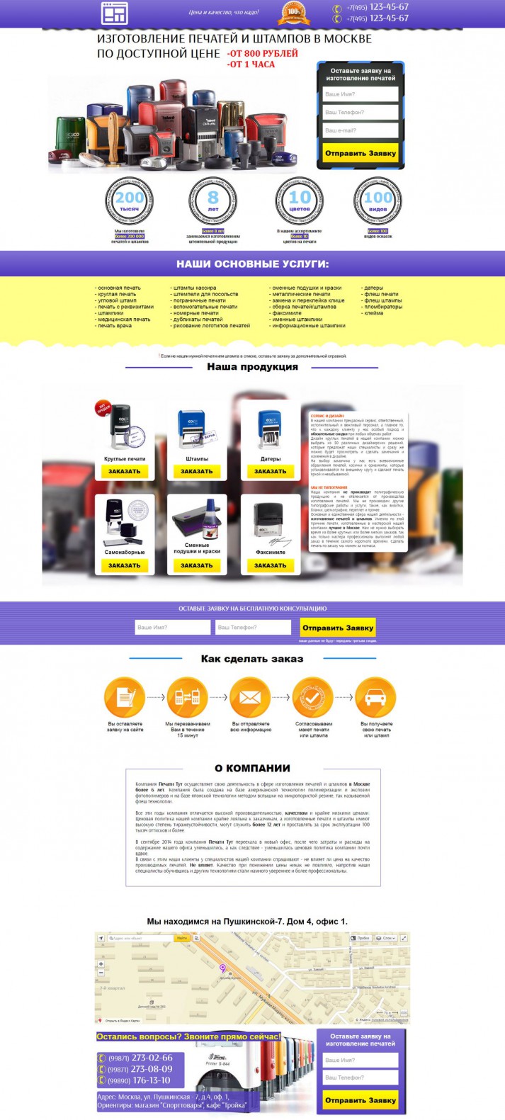 Landing page (Лендинг пейдж) на продажу- это готовый сайт по изготовлению штампов и печатей. Выполнен в соответствии с новейшими инструментами маркетинга, имеет привлекательный дизайн и высокую коверсию.