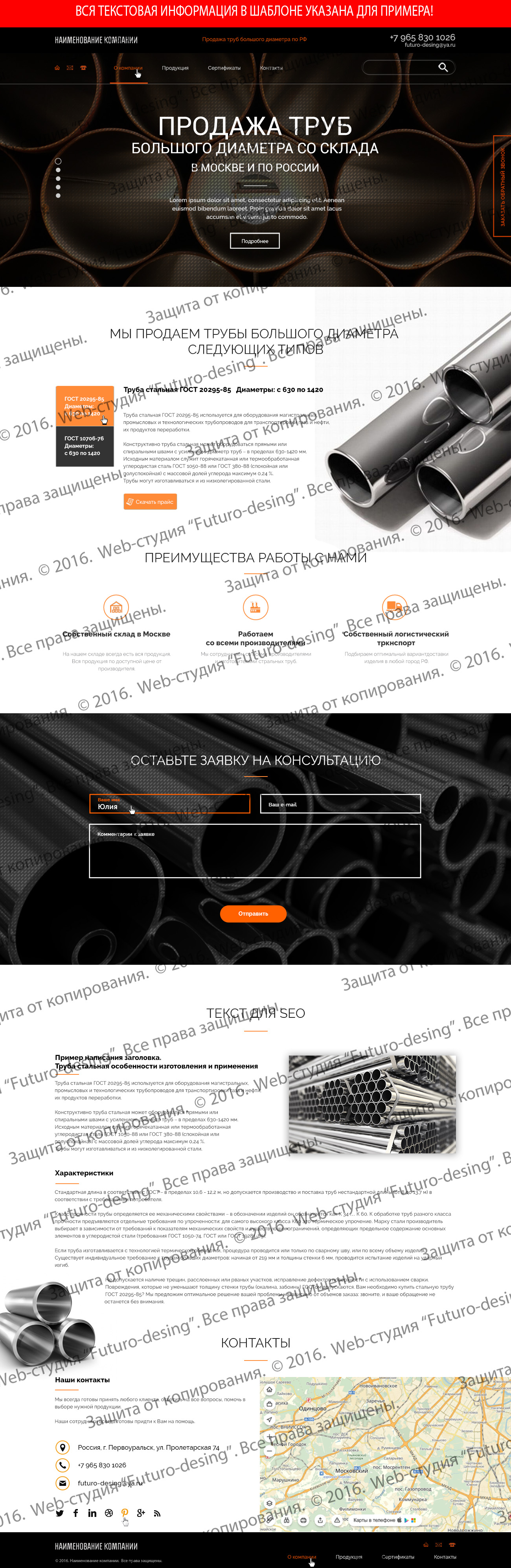 предлагаю вашему внимаю макет psd формата Landing page "Продажа стальный труб". Данная тематика подойдет предприятий кто занимается металлургией, также для предприятий кто занимается не только изготовление, но и продажой и поставкой. Приятная цветовая гамма, креативные изображения, аналогичного дизайна вы уже не встретите.