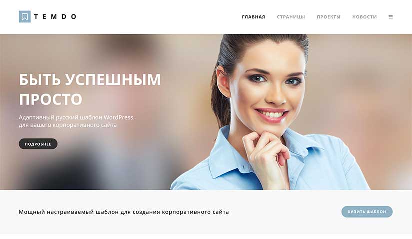 Русский адаптивный шаблон для корпоративного сайта. Современный легкий дизайн с фокусом на контенте. В шаблоне все настраивается: начиная от состава страниц и заканчивая анимационными эффектами.