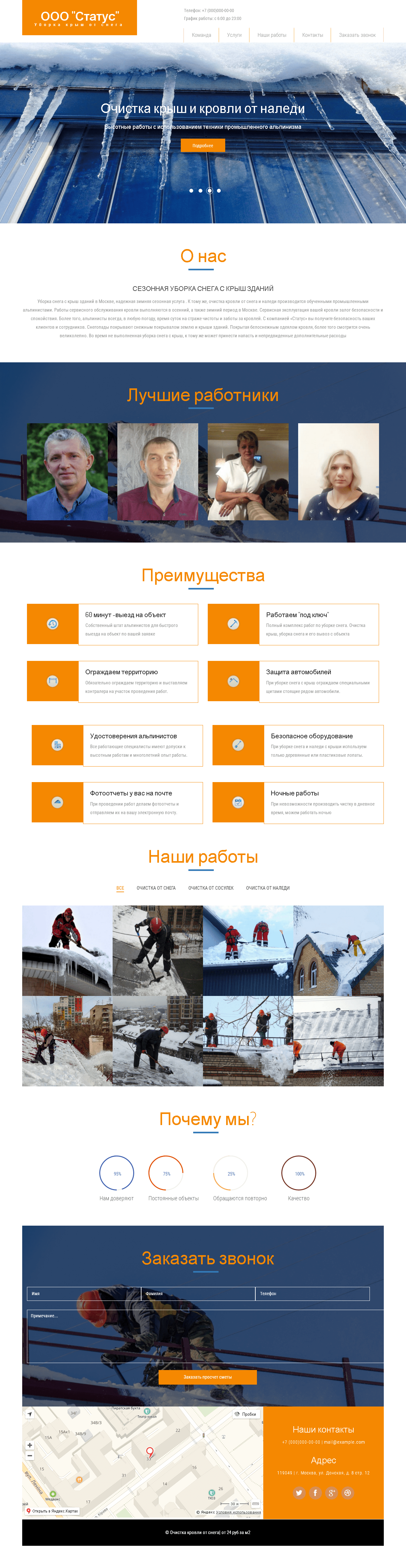 Готовый лендинг для тех, кто оказывает услуги по уборке крыш и кровли от снега и сосулек. Адаптивный дизайн сайта не даст упустить ни единого клиента.Обращаться в лс
