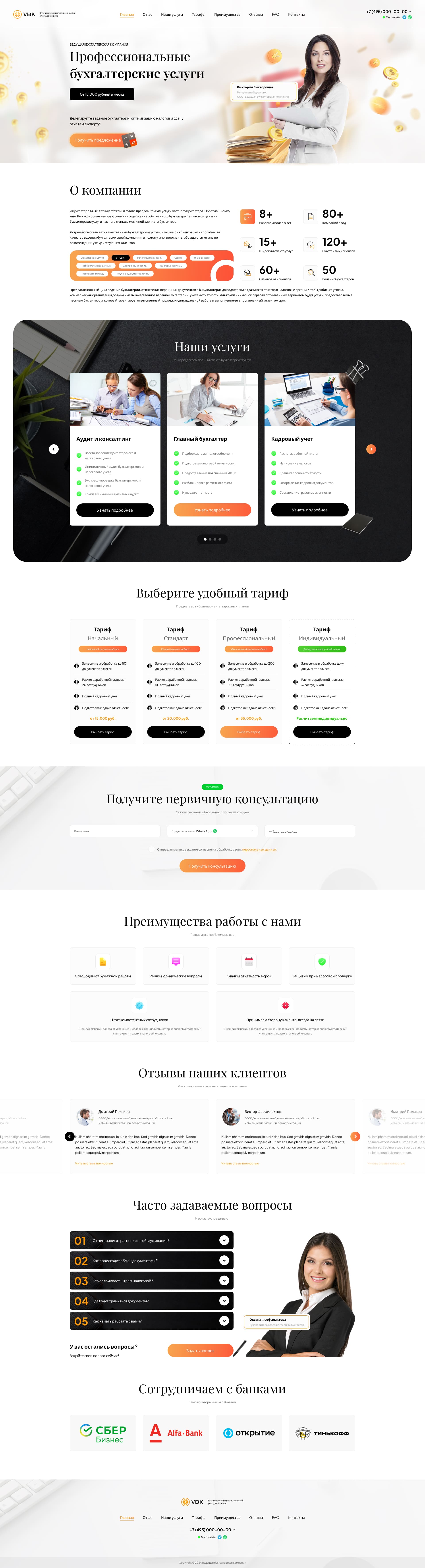 Готовый Landing Page тематики - бухгалтерия, финансовый учет, бизнес. Сайт полностью готов к работе, сверстаны и настроены все формы заявок, всплывающие окна, блоки FAQ и тд. Верстка HTML, CSS, JS. Простая установка: загрузить содержимое архива в корень папки public_html или другой папки в корне public_html - готово. Адаптирован: PC, tablet, mobile. Файл index_html открывается любым текстовым редактором, меняем текст "рыбу" на свой контент, не забываем отредактировать контактные формы (телефон, емейл).
